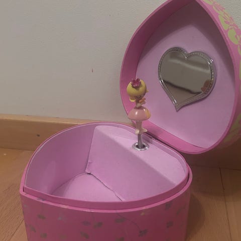 Vaaleanpunainen Disney prinsessoilla kuvitettu korurasia, jossa kaksi kerrosta. Sisällä pyörivä prinsessa figuuri.