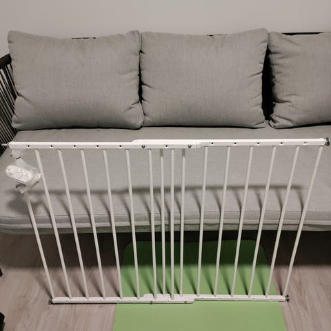 Lemmikkiporttina käytössä ollut turvaportti. Myynnissä ollut myös lapsiporttina. Kiinnitetään oviaukkoon puristusmekanismilla. Menee perusleveään oviaukkoon.
