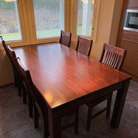 Uusi käyttämätön ruokailuryhmä ASKOn mallistosta. Kansi valkoöljyttyä tammiviilua