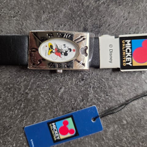 Disney Minnie Mouse lasten herätyskello, jossa on kellotaulu, jossa Minnien kasvot. Kellossa on punainen ja musta väri sekä keltainen rusetti. Takana on kytkin ja paristokotelo. Kellon mukana tulee alkuperäinen laatikko, jossa on Mickey Mouse Kids -logo. Korkeus 11,5 cm, leveys 9 cm.