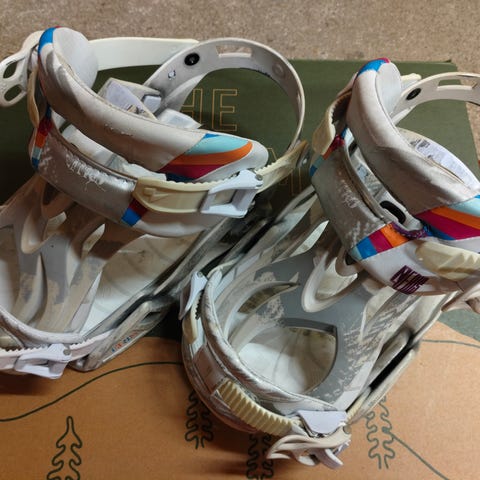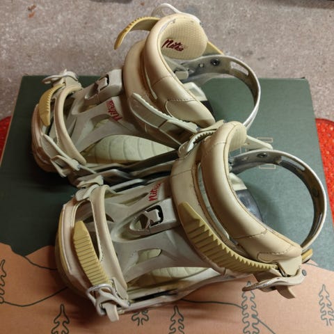Nitro Team lumilautasiteet, koko M, toimivat hyvin mutta toinen lukko ei mene automaattisesti takaisin kuten kuvasta näkyy.