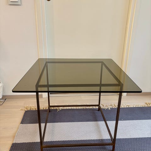Sohvapöytä/cocktail-pöytä/coffee table; lasia ja metallia. Valkoiset tasot, joissa lasipinnat. Mattakullan sävyiset jalat.