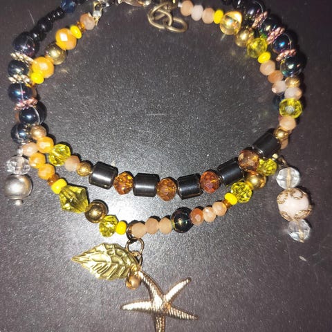 Kirjainhelmistä tehtyjä osioita, ja osiot kiinnitetty toisiinsa o-renkailla. Normaali lukkokiinnitys. Rannekoru on uusi, käsityönä valmistettu. Käy hyvin joululahjaksi. Mieluummin ilman toridiiliä, mutta diililläkin onnistuu. Ostajalle postit.