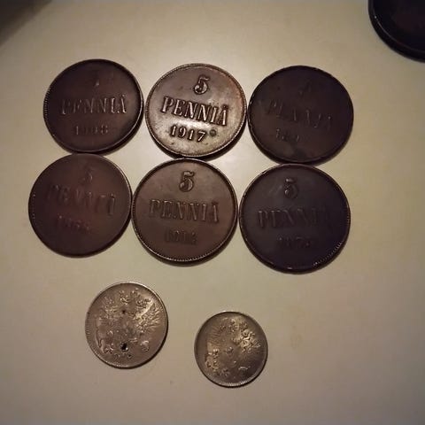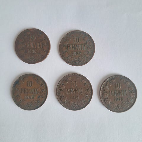 Myydään vanhat 10 pennin kolikot vuosilta 1866,1895,1897,1897,1900,1907,,1908,1909,1915,1916,1916,1917.Voit tarjota hintaa.
