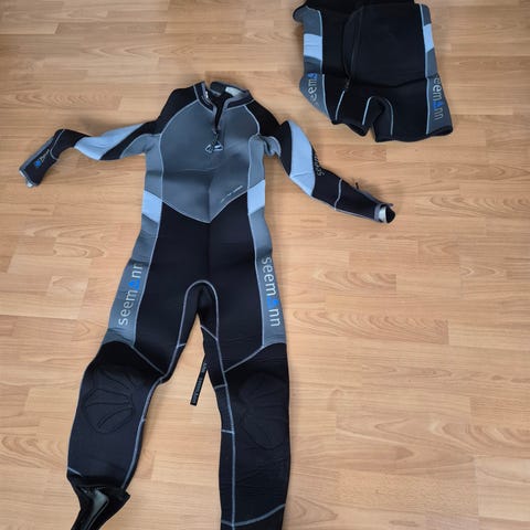 Seemann Sub märkäpuku, puku-osa 7mm, koko 48, vetoketju selässä ja vetoketjut ranteissa sekä nilkoissa. Torso-osa 7mm, koko 50, vetoketju edessä, hupullinen.