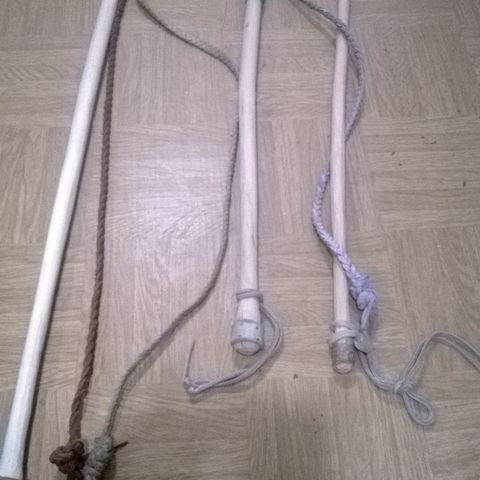 Vanhat nahkainen ja puinen ruoskat. Punotti nahkaruoska pyisella kädensijalla.