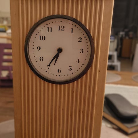 Se on kineettinen ja geometrinen seinäkello, jonka kellotaulu koostuu ympyrä- ja kolmiosioista vahvoin värein kontrastina, luoden abstraktin koostumuksen, joka 'muuttuu' ajan myötä.