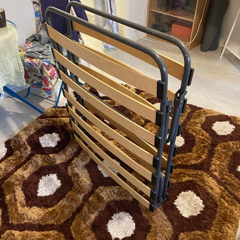 Metallinen patjanjousitusrunko, jossa on useita jousia ja kierrettyjä metalliosia. Rakenne on tarkoitettu patjan tukemiseen ja se sopii erilaisiin sänkyihin. Koko 79 x 198 cm, eli jos sänky tms on 200x 90 kokoinen