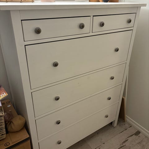 Hemnes korkea lipasto, koostuu 5 laatikosta, erittäin siisti. Mekanismi on toimiva, jonkin verran kulumisen jälkiä vaikuttamatta toimivuuteen ja estetiikkaan, tämä vaatekaappi sopii pieneen tilaan.
