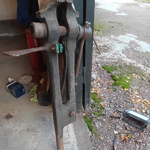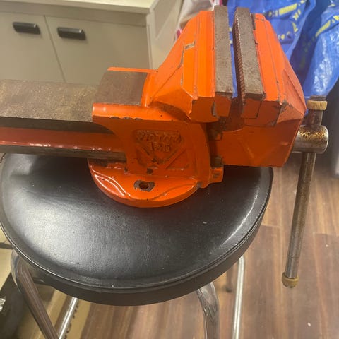Kuvan mukainen järeä ruuvipenkki odottaa seuraavaa käyttäjää. Käytön jälkiä, mutta toimii.