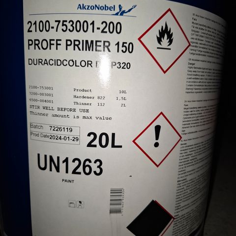 Saatavilla avaamaton Primer pullo sekä avattu pullo, jossa ehkä puolet jäljellä. Mira multicoat kosteussuojaa jäljelläehkä puoli ämpäriä.