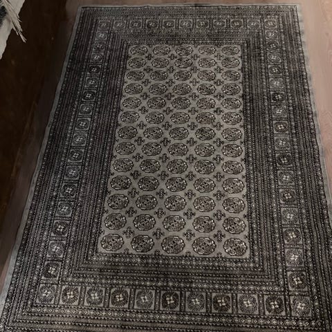 Itämaisen tyylinen matto. Musta, beige ja valkoinen. Yhdestä kohtaa puuttuu osa reunahapsuista (kts. Kuva 2).