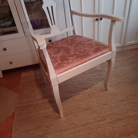 Neljä kappaletta antiikiituoleja (pöytä ei myytävänä) jotka saa maalaamalla varmasti todella hienoiksi, tuoleihin saa halutessaan kaupan päälle kuvissa näkyvät vihreät istuintyynyt