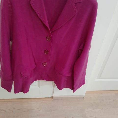 Fuksia vyöllinen neulejakku jossa rimpsua kauluksessa ja myös helmassa.puuvillaneulosta.postit 11,90.Halutessa saa pitkän fuksian vekkihameen mukaan.