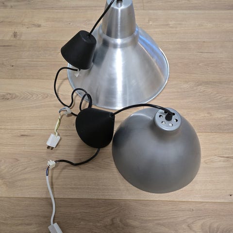 Myyntiin 2 UUTTA riippuvalaisinta, vaalean harmaita. Yhden hinta 12 e, jos otat molemmat, 20 e yhteensä. Voin postittaa, postit. lisätään. Pöytä niiden alla myös kaupan. Tarjoa vaikka könttihintaa.