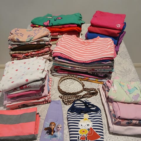 Tyttöjen kesä vaatteita, sisältää muutaman pitkähihaisen ja housut. Suurin osa vaatteista kokoa 104-110. Muuten koko väli 98-116. Nouto Piispanristiltä.