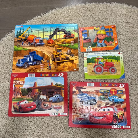 Palapelit 7kpl lapsille.Kaikissa palat tallella.Kuvassa alhaalla vasemmalla autot palapelistä puuttuu pieni pala palasta.