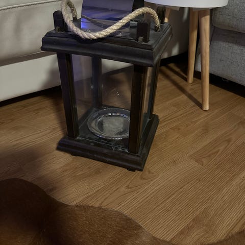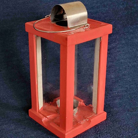 Vanha puinen tallilyhty. Yksi laseista on nostettavissa pois kynttilän vaihtoa varten.