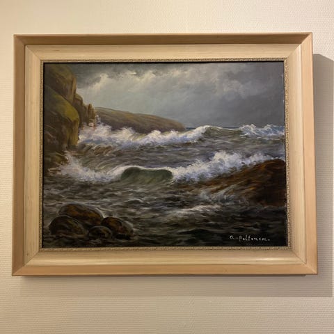Taidemaalari, graafikko Inari Krohnin kesäinen akryylimaalaus kankaalle vuodelta 1990. Aihe Turun saaristosta. Akryyli kankaalle, koko 57 x 49 cm.