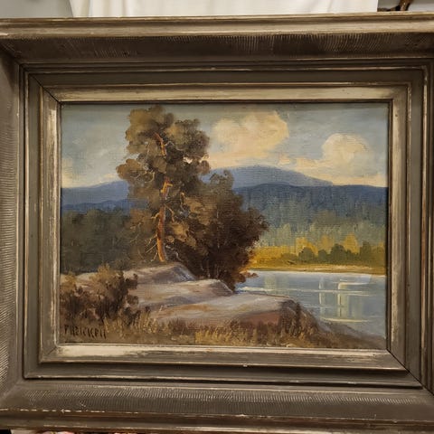 Axel Haartmanin öljyvärityö "Talvi-ilta" vuodelta 1923. Työn korkeus on 25 cm ja leveys 32 cm. Kehys 41 X 48 cm.