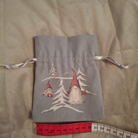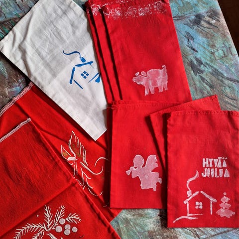Pakkaa lahjat kankaisiin joulupusseihin, uusia kestopusseja. Kaikki yhteensä 10e