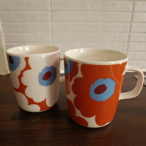 Myydään käytössä olleet, mutta ehyet marimekko unikko mukit 2.5 dl (2kpl) ja lautaset 20cm (2kpl).