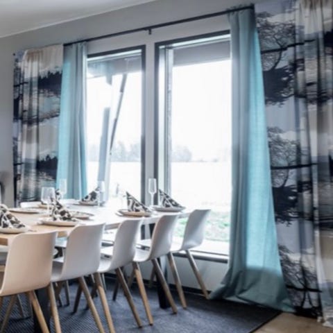 Tumman turkoosit sametti verhot. Verhot ovat siistit, savuttomat ja hajuttomat, mutta silittämättömät.
