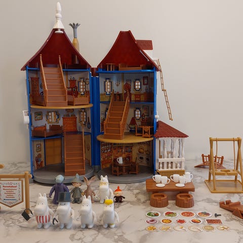 Muumi- piparkakkutalo reikäikkunoin 17x17 tontilla.Asetelmassa 6 muumihahmo. Voi laittaa pienen led-valon pohjassa olevan reiän kautta valaisemaan rakennusta. Korkeus n.26 cm. Talon kaikki osat syötäviä. Vain nouto.