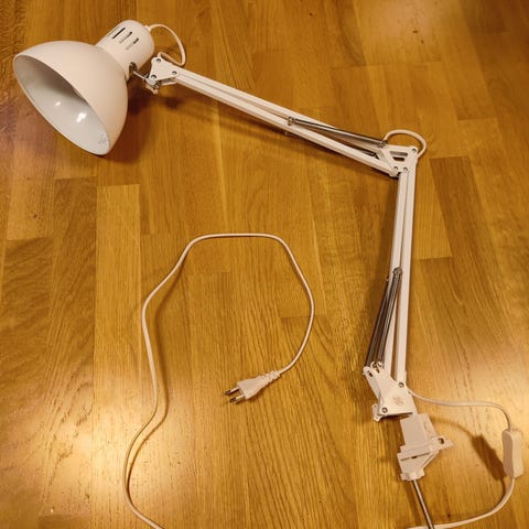 Työvalo, jota voi taivuttaa haluamaansa suuntaan. Jalasta löytyy pieniä naarmuja ja kulumaa, samoin lamppukuvussa hieman kulumajälkiä. Ei tahdo kuviin millään saada, eivätkä muutenkaan kovin näkyviä ole. Hieno hopean värinen.
