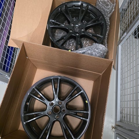 Käyttämättömät Model Y:n vanteen keskiöt. Pitäisi käydä myös Model 3:een.