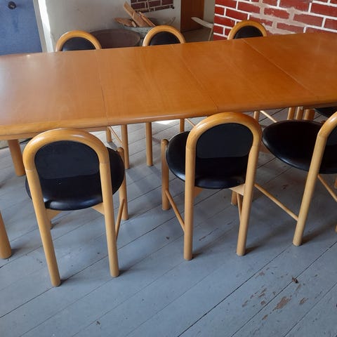 Myynnissä hyväkuntoinen ruokailuryhmä, johon kuuluu pöytä ja kuusi tuolia.
