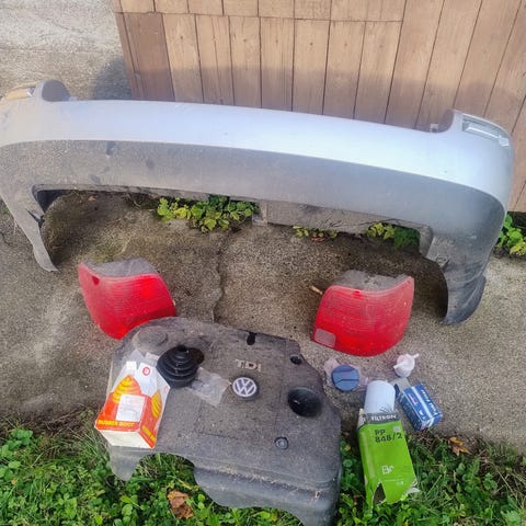 Valkoinen r mallin etupuskuri, jossa alapuolella vikaa. Näkyy kuvassa. Mukaan vasen sumuvalo ja kehys. Myös muut kuvan osat on tähän puskuriin kuuluvia osia. Tämä osa löytyy Espoosta ja on noudettava sieltä tai kulkeutuu myös Hyvinkäälle.