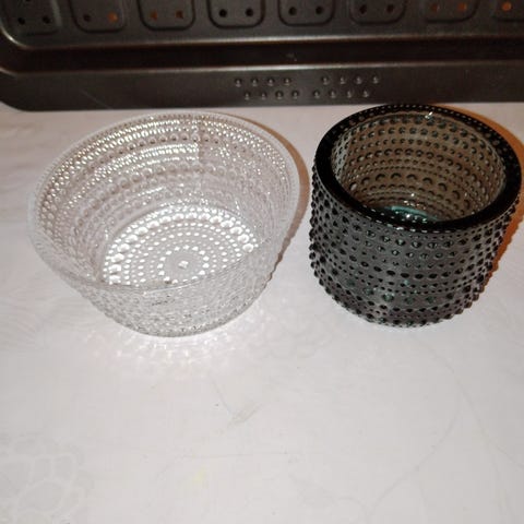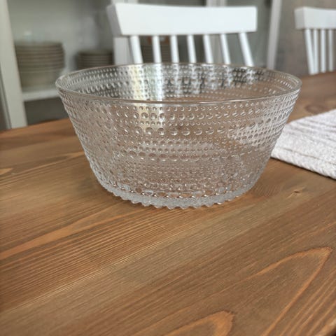 Iittala Kastehelmi lasikulho, jossa on koristeellinen pisarakuviollinen pinta. Kunnoltaan kuin uusi, jäänyt hyvin vähälle käytölle.