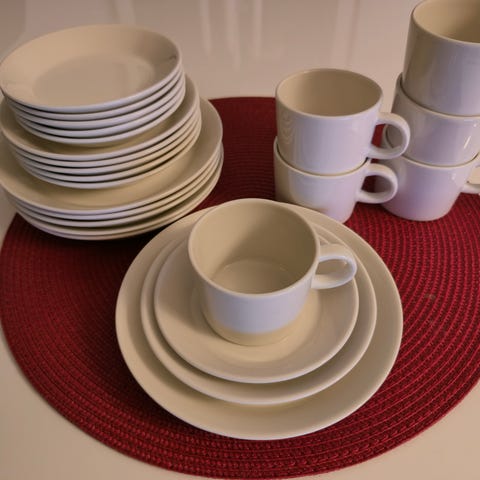 Kaikki ehjiä, lautasissa ruokailuvälistä tulleita naarmuja.