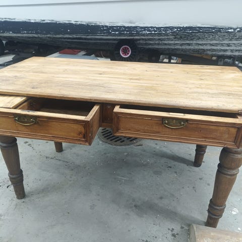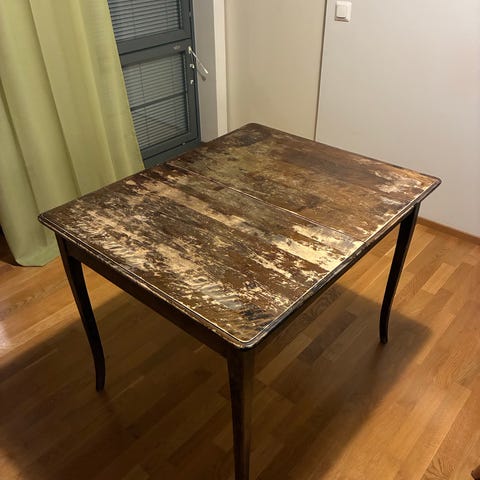 Kaipaisi hiontaa ja uutta pintakäsittelyä, on kulumaa. Jaloissa on kellertävämpi, vanha lakka.