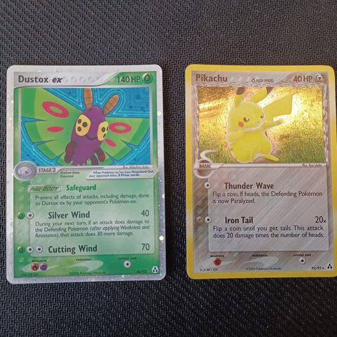 Pikachu delta species, dustox ex ja muutama holot ja reverse holot. Perus postitus 3€ tai kuplamuovikirjessa 5€. Mobilepay löytyy