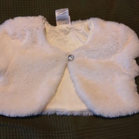 Edessä kiinitys rusetilla. Kiinnitysnauha irronnut toisesta päästä, helppo ommella.