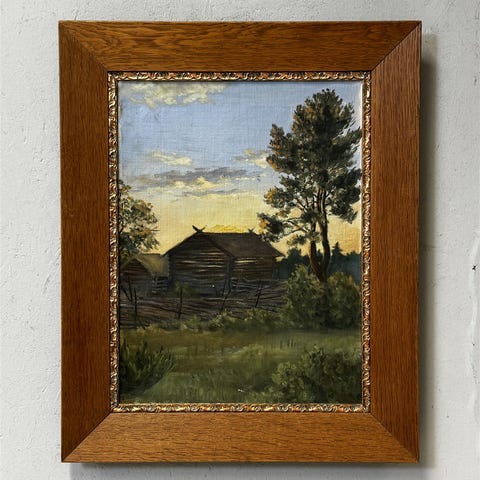Öljyvärimaalaus, jossa on kuvattuna maalaismaisema. Teos on kehystetty koristeellisilla kultakehyksillä. Alareunassa on signeeraus hieman piilossa M Pitkänen.