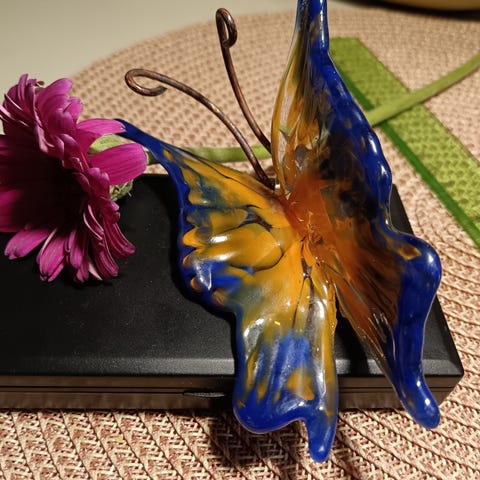 Lasinen perhoskoriste ikkunaan. Uniikki kappale, tekijä Lasini / Sini Louko. Ripustus siimalla (mukana).