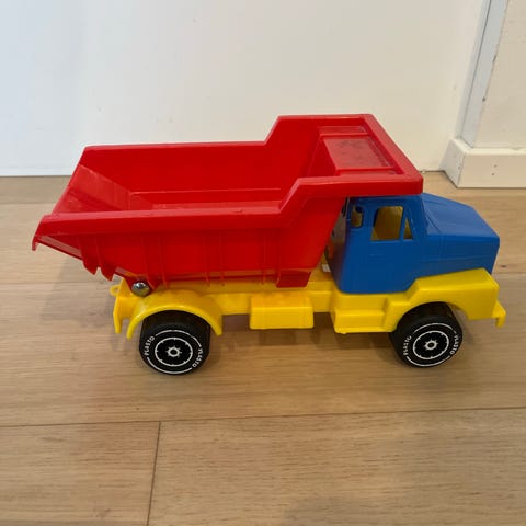Plasto lasten leluauto kuorma-auto, valmistettu muovista. Leikkiauto on punainen ja musta, ja siinä on kuorma-auton muotoilu. Soveltuu lasten leikkeihin.