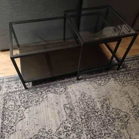 IKEA kaksiosainen Vittsjö sivupöytä, jossa musta metallirunko ja lasikansi. Pöydän mitat ovat 90 cm leveys, 45 cm syvyys ja 48 cm korkeus. Pöydässä on myös alahylly, joka tarjoaa lisäsäilytystilaa. Haku mielellään tänään tai sunnuntaina 21.12.