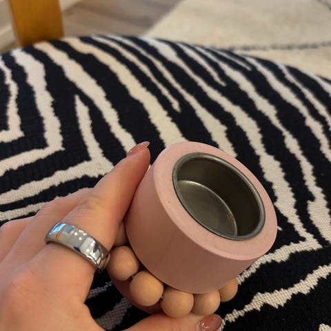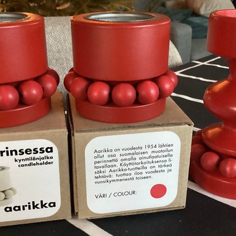 Aarikan Prinsessa sopii tuikulle ja kruunukynttilälle. Puuosa viininpunainen, metalliosa hopea. Mitat K 5,5, Ø 6 cm.