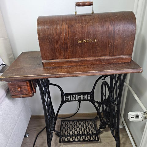 Annetaan Singer-ompelukone. Kone toimii ja mukaan neuloja, muutamia lankoja.