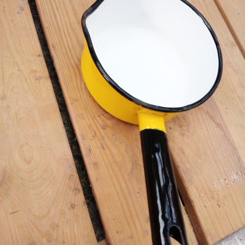 Ruskea, iso emalikattila. Hinta 10 euroa.