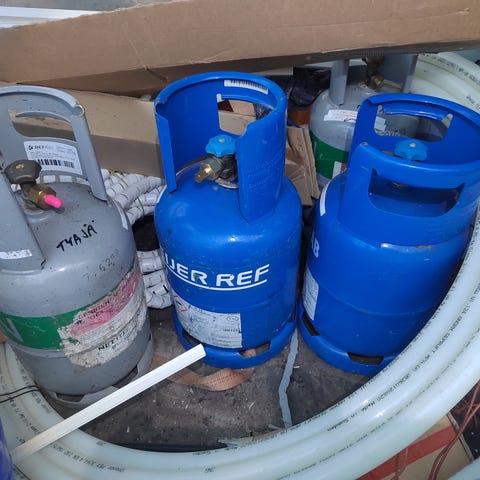 1/4" liitännällä talteenottoon tai jätepulloksi ollut r410a talteenotto pulloina. Tyhjä ja vakuumissa.