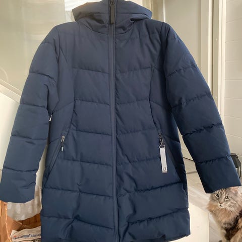 Siisti Luhdan vaaleanharmaa toppatakki vaaleanpunaisella vuorella. On lämmin, mutta ei älyttömän paksu. Hieman kevyttoppatakkia paksumpi. Hihoihin, helmaan ja huppuun laitettu heijastinteipit. Malli on kevyesti muotoiltu, nätti päällä.