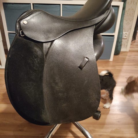 Hyväkuntoinen ja siisti Mustang Europa yleissatula. Istuin 17". Leveys 33. Väri musta. Nahkaosat hyvässä kunnossa. Sopii kaarevahkoon selkään.