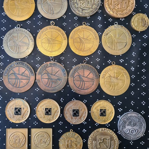 Urheilumitallit 7kpl 70-90luvulta. Kaikki 15e .Voin postittaa pk.t ostajalle.
