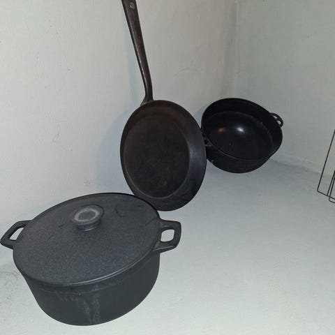 Kolme valurautapannua. Paistinpannut 16 cm ja 23 cm sekä lettupannu 23 cm. Pannut on juuri rasvapoltettu. Nouto.