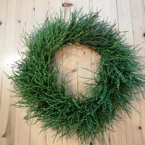 Iso tonttukranssi. Solmittu halkaisijaltaan 25 cm olevaan metallirenkaaseen. Näitä kaksi, tyttö ja poika kranssi